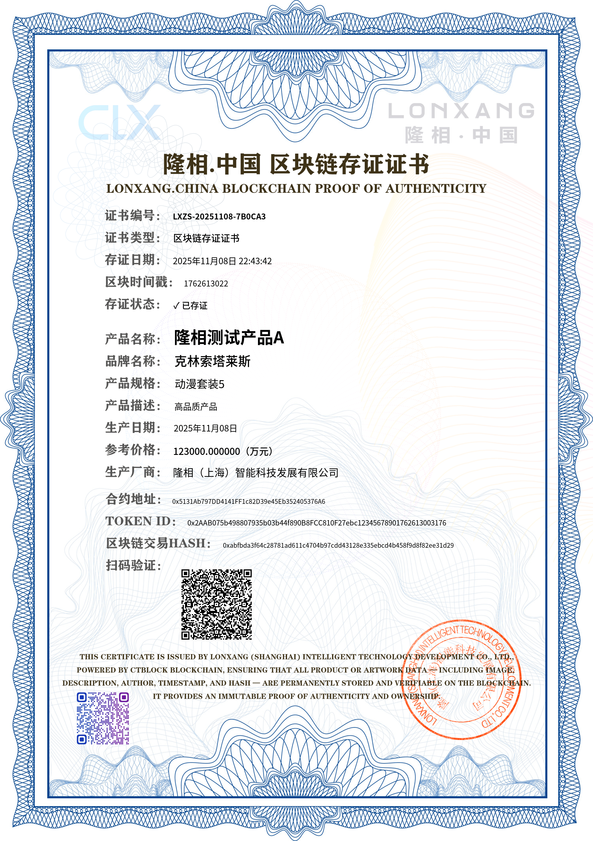 证书说明: 本证书由区块链技术保障,具有不可篡改、永久可追溯的特性。您可以保存或打印此证书作为产品正品凭证。
