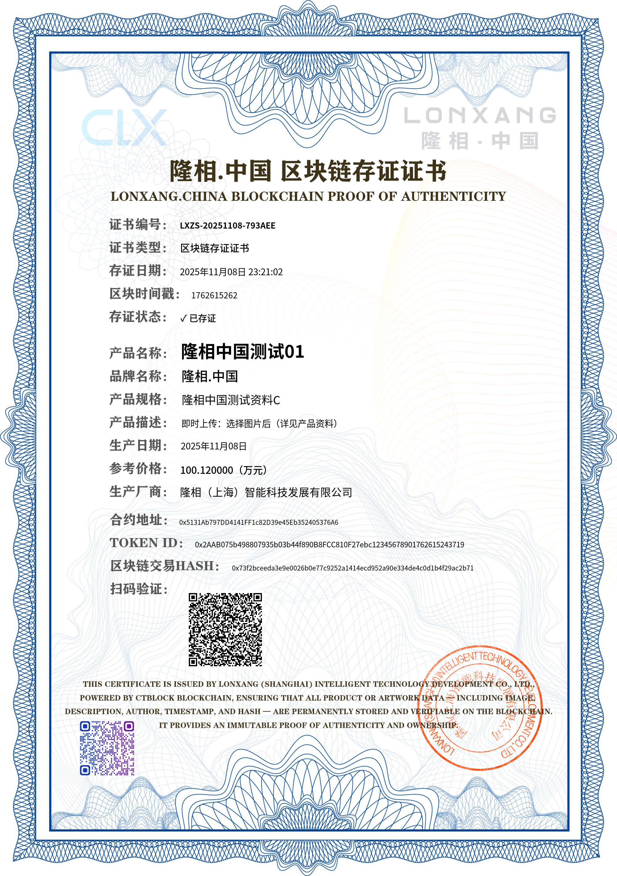 证书说明: 本证书由区块链技术保障,具有不可篡改、永久可追溯的特性。您可以保存或打印此证书作为产品正品凭证。