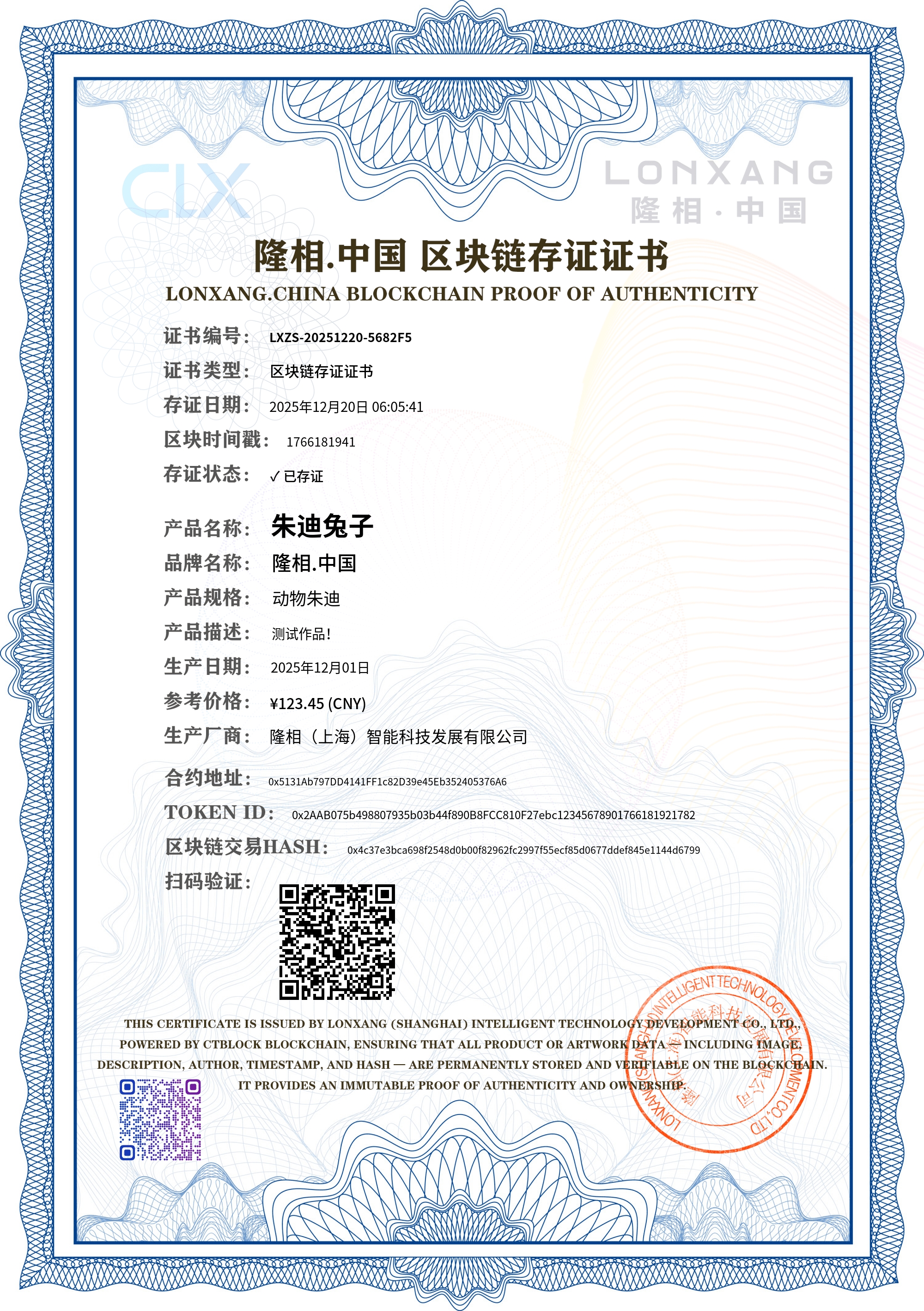 证书说明: 本证书由区块链技术保障,具有不可篡改、永久可追溯的特性。您可以保存或打印此证书作为产品正品凭证。