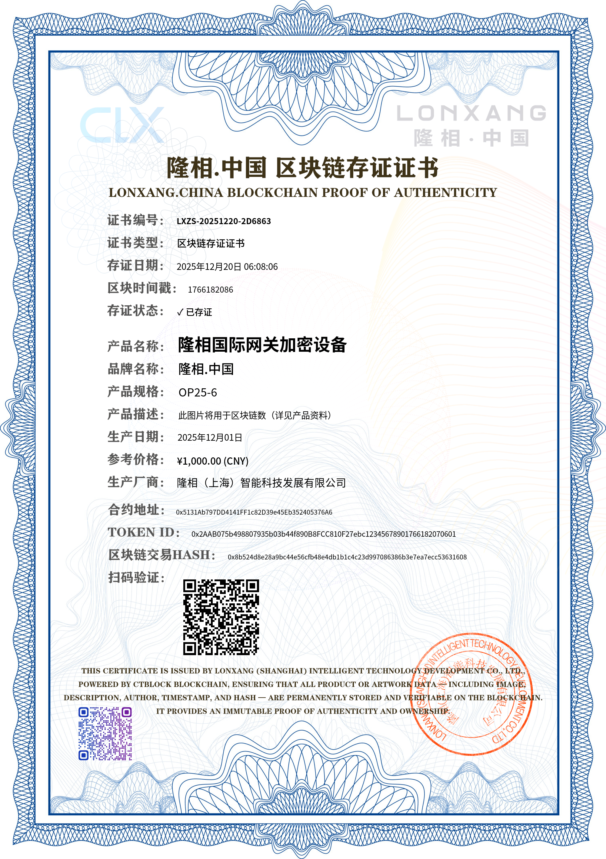证书说明: 本证书由区块链技术保障,具有不可篡改、永久可追溯的特性。您可以保存或打印此证书作为产品正品凭证。